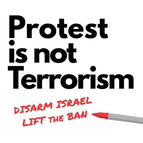 We are urging trade unionists, activists in the Palestine solidarity and anti-war movements and anyone who wants to defend the right to protest and show their solidarity with people risking arrest by witnessing the action and holding signs condemning repression. Please RSVP here so that we can update you with information about about the event. You can also sign up for our mailing list about future activities and to get updates on defence campaigns for people arrested and charged.