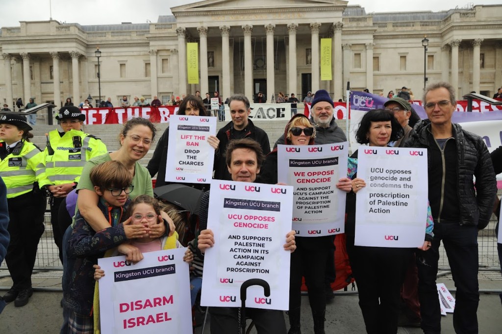 There were branch banners and union members from UCU London Region, Kingston Uni UCU, Imperial College UCU, UCL UCU, City and Islington College UCU, Hackney College UCU, London School of Economics UCU, Lincoln Uni UCU, Greenwich Uni UCU, Birkbeck UCU, Camden Unison, Homerton Hospital Unison, Portsmouth City Unison, Portsmouth Trades Council, NEU Cambridgeshire, NEU Hackney, NEU Warwickshire and NEU Brent, plus members of Unite, NUJ and Bectu. Solidarity from other organisations included delegations from Cage International, Muslim Students for Palestine, XR, Quaker Palestine Solidarity, International Jewish Anti-Zionist Network and Stop The War.